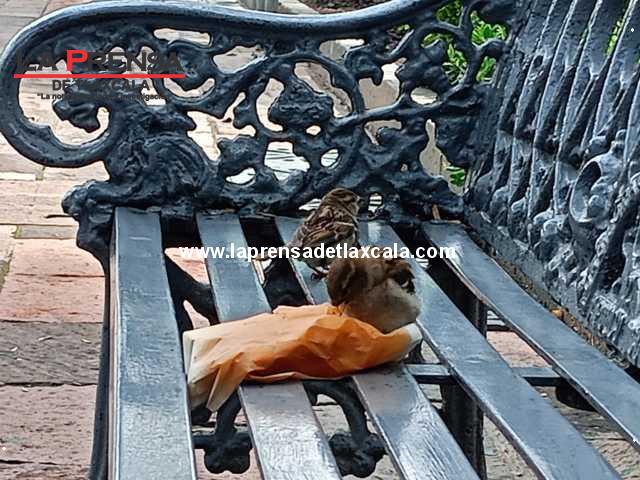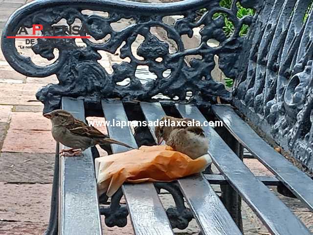 En un recorrido por la Plaza de la Constitución, en la capital tlaxcalteca, se pudo observar la presencia de restos de comida específicamente tacos abandonados sobre las bancas del lugar. Esta situación atrajo rápidamente a aves que se dieron un festín con los alimentos dejados a la intemperie.