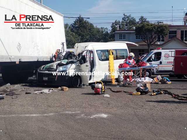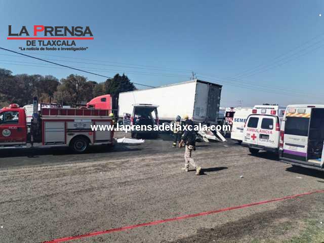 Tetla de la Solidaridad, Tlaxcala.– Este lunes 20 de mayo, un grave accidente vial tuvo lugar en la carretera Mena–Ciudad Industrial Xicohténcatl, cerca del retorno de Plan de Ayala, donde una camioneta de transporte de personal de la empresa Champiñones Real Trasquila colisionó frontalmente contra un tractocamión Freightliner rojo con caja seca.
