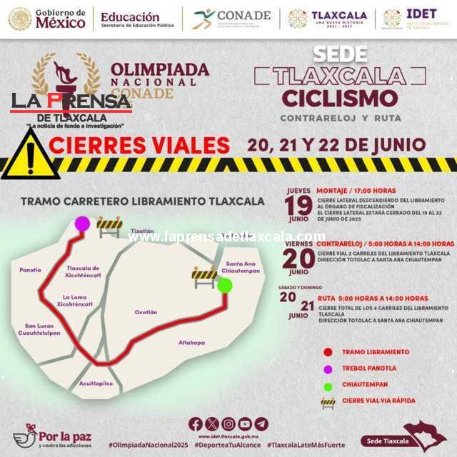 El Instituto del Deporte de Tlaxcala (IDET) anunció el cierre del Libramiento Tlaxcala, en el tramo que contempla la zona de El Trébol hasta la entrada del municipio de Chiautempan, a partir del próximo jueves 19 de junio hasta el domingo 22, como medida para garantizar la seguridad de atletas y delegaciones que participarán en la disciplina de Ciclismo en su modalidad contrarreloj y ruta, en las ramas femenil y varonil.