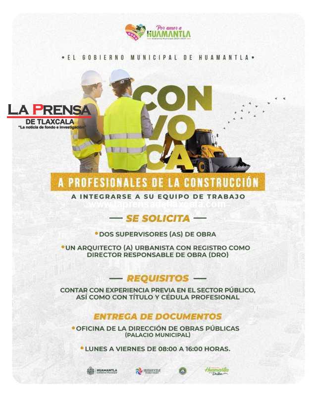 El Gobierno Municipal de Huamantla, a través de la Dirección de Obras Públicas y Desarrollo Urbano, invita a profesionales de la construcción a integrarse a su equipo de trabajo, con el objetivo de fortalecer la labor institucional en este importante sector.