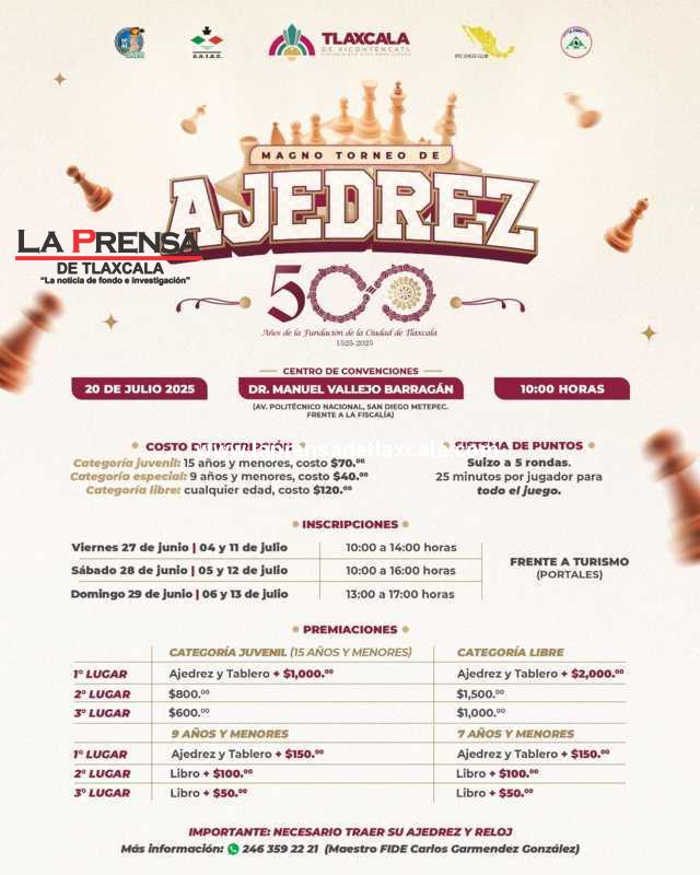 Con motivo de los festejos por los 500 años de la fundación de la ciudad de Tlaxcala, el Ayuntamiento que preside Alfonso Sánchez García, invita al público en general a participar en el Magno Torneo de Ajedrez organizado por la Escuela Garméndez, un evento que reunirá a entusiastas de este milenario juego de estrategia de todas las edades.