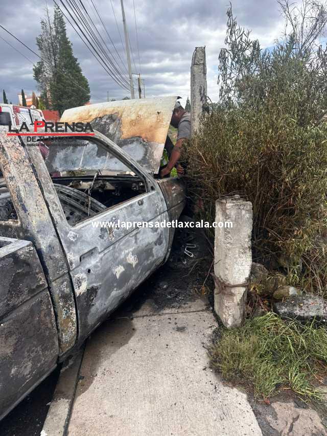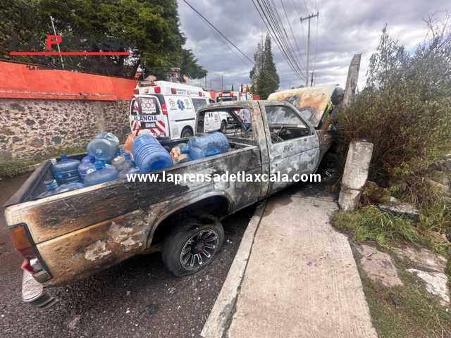 Esta tarde, una camioneta Nissan 1987 que transportaba galones de agua se incendió en la calle Ignacio Zaragoza, San Luis Apizaquito. Protección Civil Municipal controló las llamas que consumían parcialmente el vehículo.