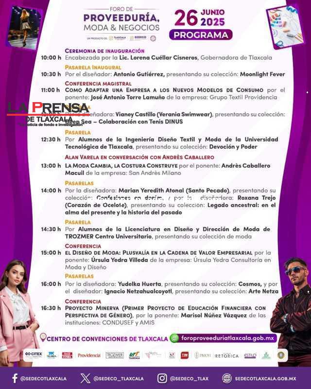 La Secretaría de Desarrollo Económico (Sedeco) dio a conocer que el Foro de Proveeduría Moda y Negocios 2025 reunirá, este 26 de junio en el Centro de Convenciones de Tlaxcala, a profesionales del diseño, estudiantes, empresarios y actores clave de la industria textil y de la moda en el país.