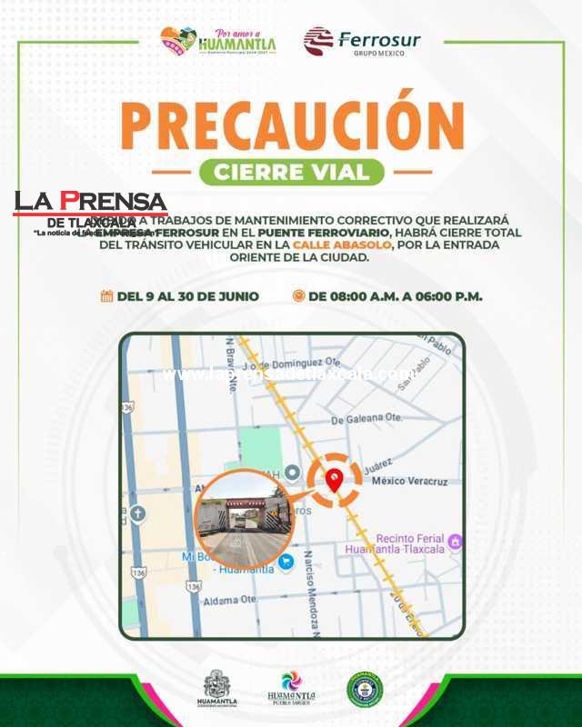 Para preservar la seguridad de la población y garantizar el mantenimiento correcto de la infraestructura urbana, el Gobierno Municipal de Huamantla informa a la ciudadanía que se llevará a cabo el cierre temporal de la calle Abasolo Oriente, en la colonia San Sebastián, debido a los trabajos de rehabilitación del puente ferroviario, que llevará a cabo la empresa Ferrosur.