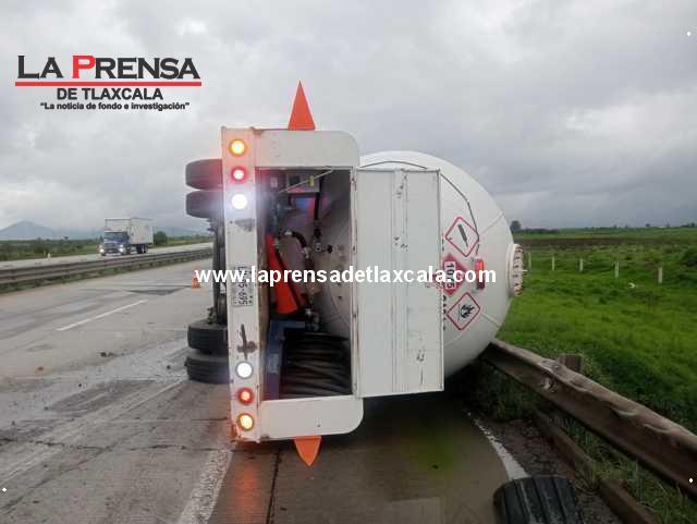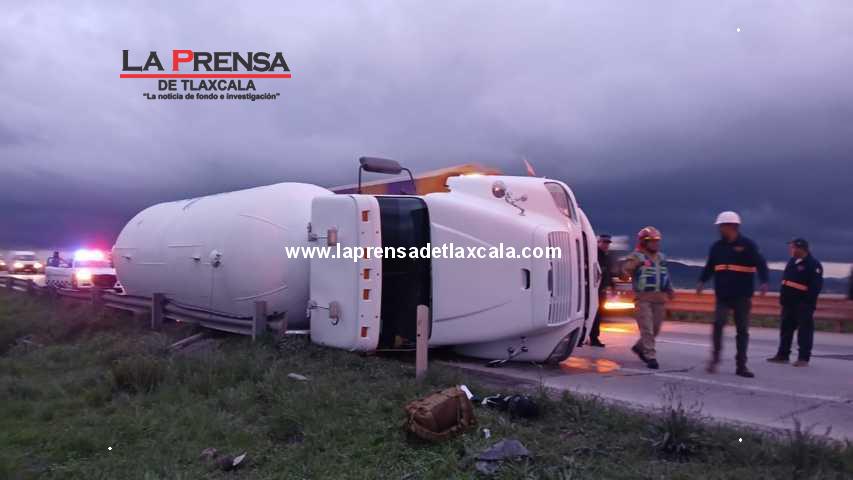 Esta tarde, una pipa de Gas LP volcó en la autopista Arco Norte (km 186+400) tras poncharse una llanta. Gracias a la pericia del conductor, José Luis N., se evitó una tragedia mayor al maniobrar y no impactar otros vehículos.