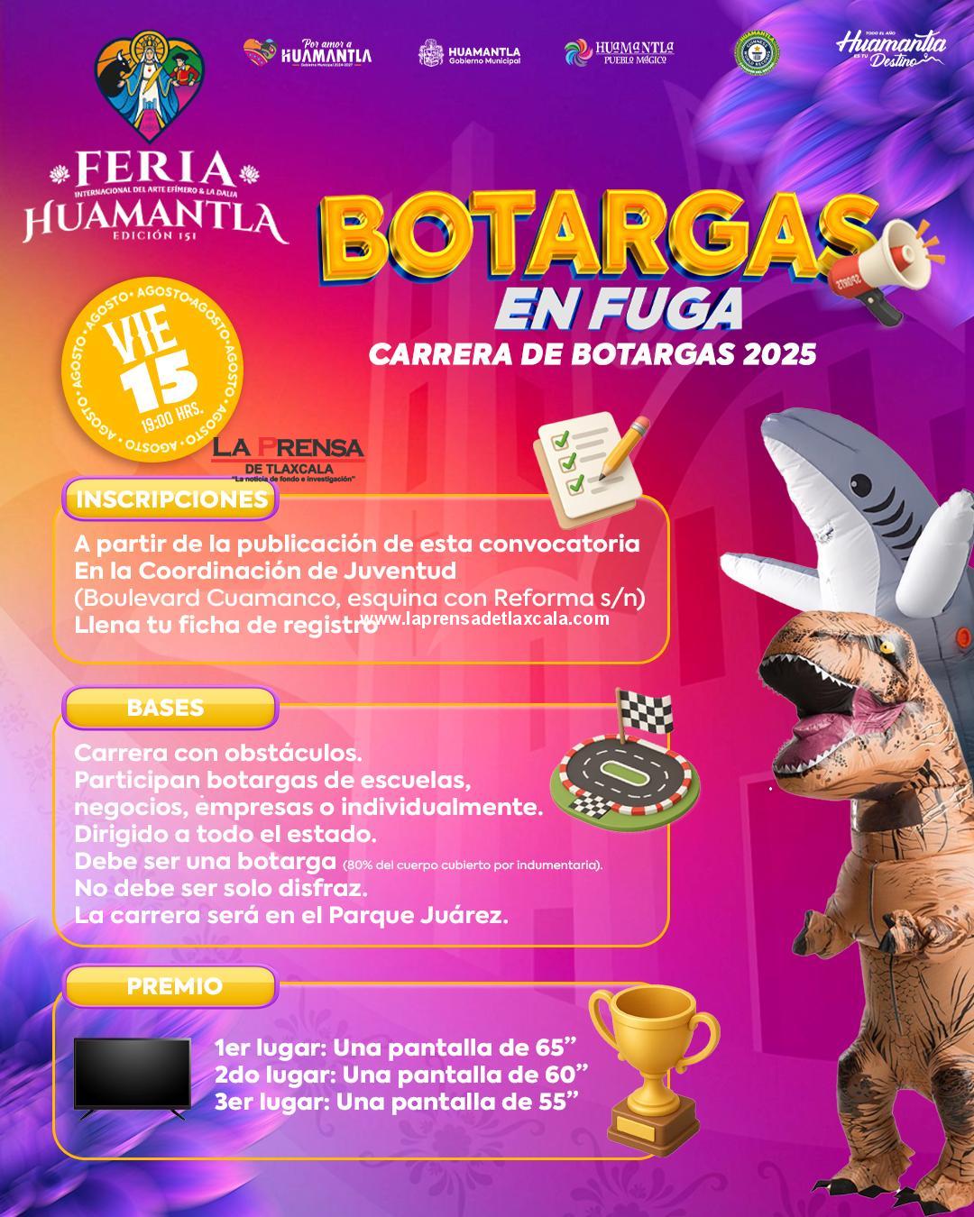 El Gobierno Municipal de Huamantla, a través de la Coordinación de Juventud, lanza la convocatoria para que las y los jóvenes del municipio participen en una de las actividades más esperadas y divertidas de la Feria Huamantla 2025: la carrera “Botargas en Fuga”.