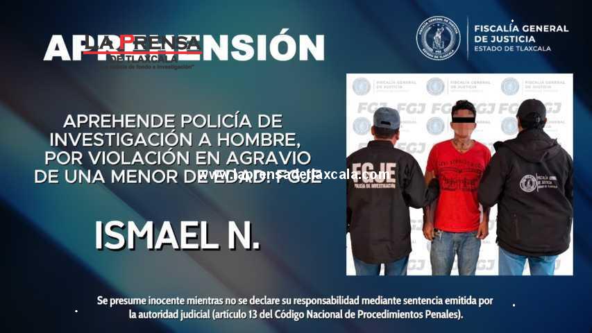 La Policía de Investigación de la Fiscalía General de Justicia del Estado (FGJE) logró la aprehensión de Ismael N., por su probable responsabilidad en el delito de violación en perjuicio de una menor de edad, en el municipio de Yauhquemehcan.