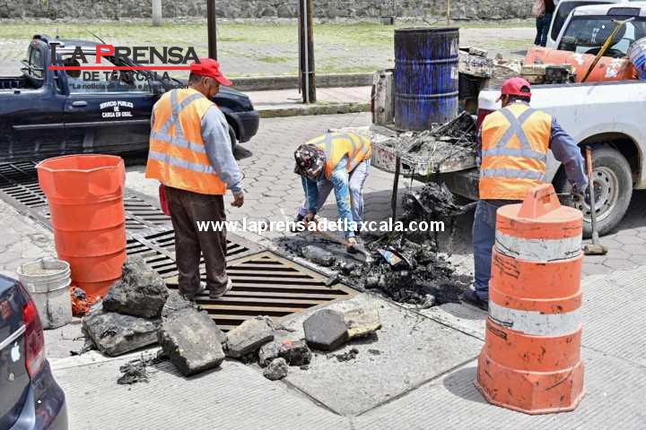 Personal de la Dirección de Obras Públicas del Ayuntamiento de Tlaxcala realizó labores de desazolve en alcantarillas y la instalación de nuevas rejillas en mal estado en la calle Ribereña, ubicada en la parte posterior del mercado, en la zona que conecta con Tizatlán.