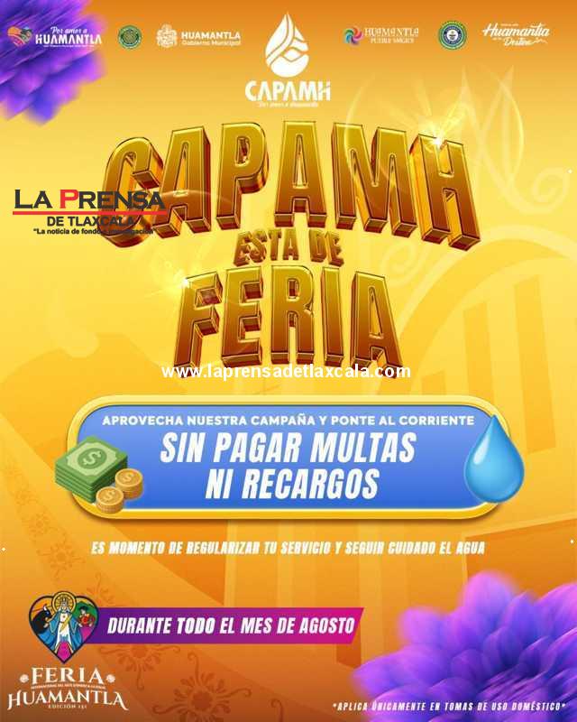 Huamantla, Tlax., — En el marco de las celebraciones por la tradicional feria de Huamantla, la Comisión de Agua Potable y Alcantarillado del Municipio de Huamantla (CAPAMH) ha puesto en marcha una campaña especial de condonación de multas y recargos, con el objetivo de facilitar a la ciudadanía la regularización de sus servicios de agua potable.
