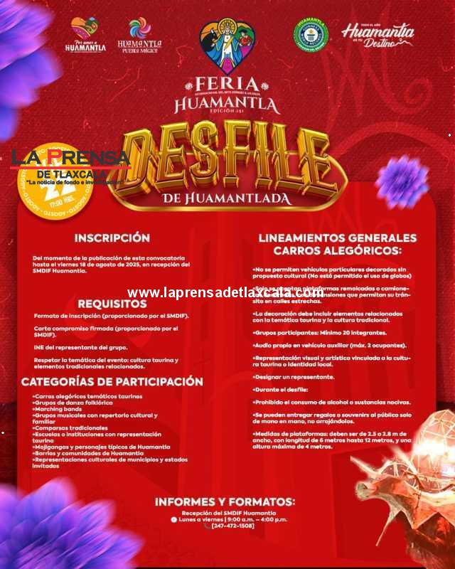 El Gobierno Municipal de Huamantla, que encabeza el presidente Salvador Santos Cedillo, convoca a todas las batucadas, comparsas, agrupaciones artísticas, colectivos culturales y a la ciudadanía entusiasta a formar parte del Desfile de Huamantlada 2025, un evento lleno de música, energía, color y orgullo huamantleco.