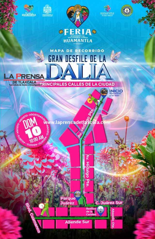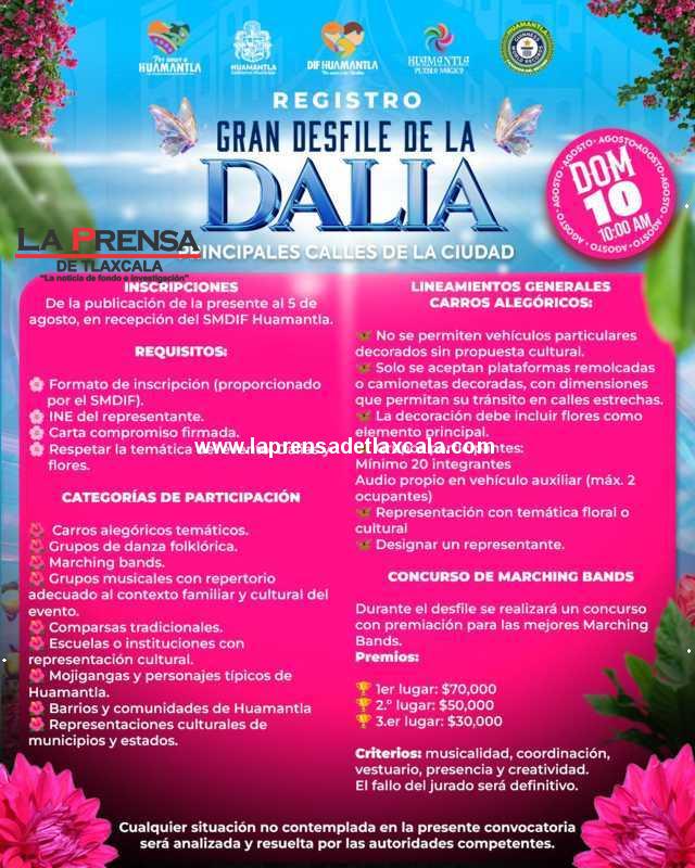 El Gobierno Municipal de Huamantla, que encabeza el presidente Salvador Santos Cedillo, convoca a instituciones educativas, organizaciones civiles, agrupaciones culturales, artísticas y a la ciudadanía en general, a participar en el tradicional Desfile de la Dalia 2025, uno de los eventos más emblemáticos de nuestra feria.