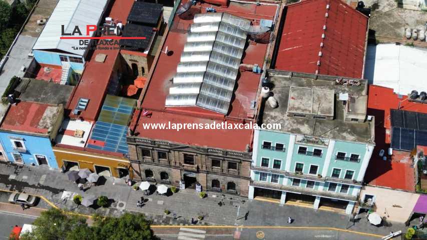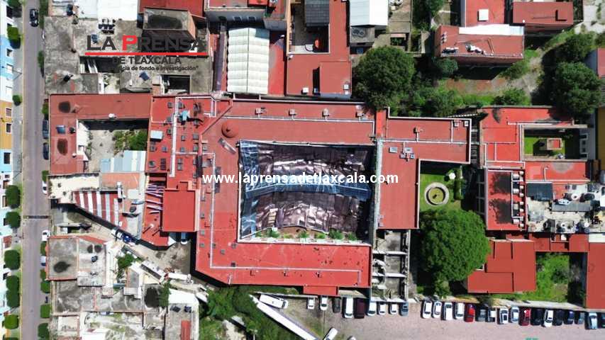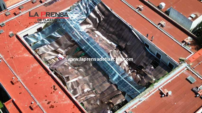Tras la fuerte granizada registrada durante la tarde del domingo, así se puede observar la estructura metálica colapsada del hotel Posada, ubicado en la capital del Estado de Tlaxcala. Se prevé que el retiro de esta techumbre tarde algunos días. Además, por esta situación no se reportaron personas lesionadas.