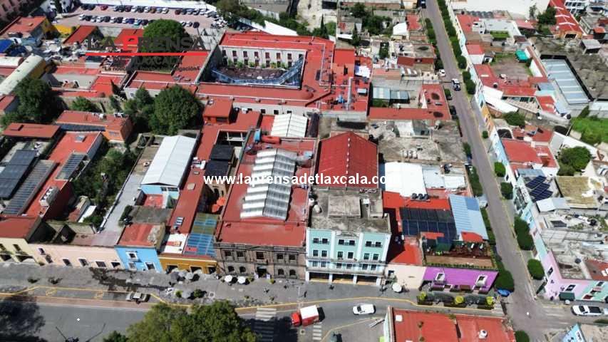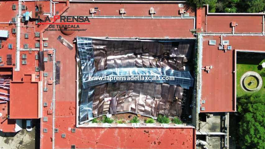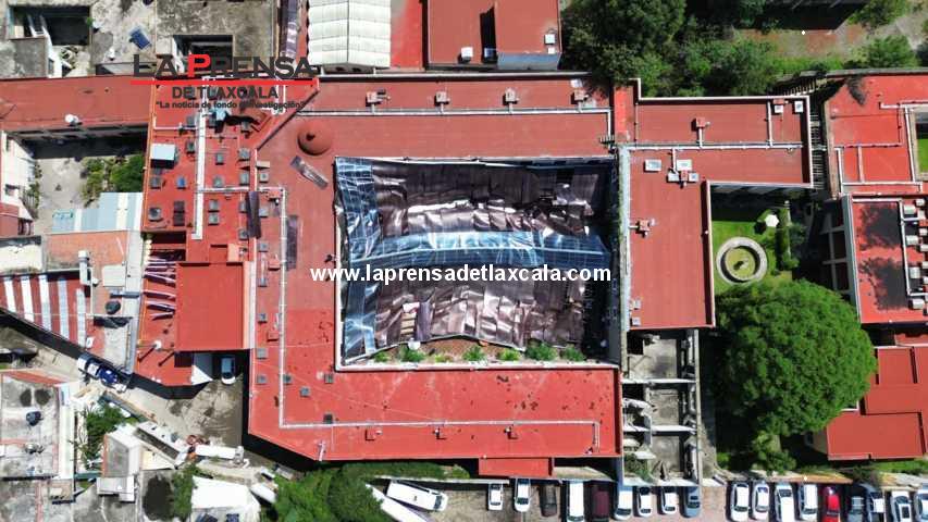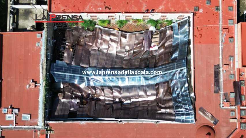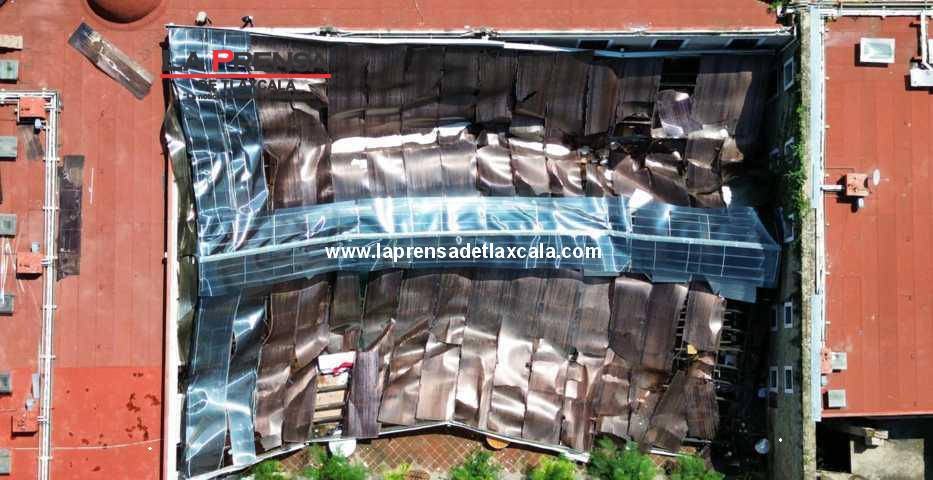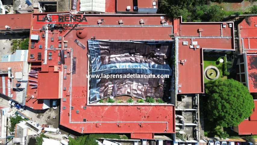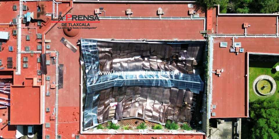 Tras la fuerte granizada registrada durante la tarde del domingo, así se puede observar la estructura metálica colapsada del hotel Posada, ubicado en la capital del Estado de Tlaxcala. Se prevé que el retiro de esta techumbre tarde algunos días. Además, por esta situación no se reportaron personas lesionadas.