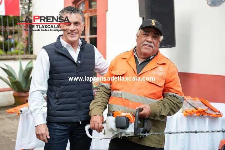 El presidente municipal Alfonso Sánchez García entregó este martes un lote de herramientas y equipo de trabajo a la Dirección de Servicios Públicos del Ayuntamiento de Tlaxcala, en un evento en el que reconoció la labor incansable del personal de esta área, que diariamente, muchas veces bajo la lluvia o el intenso sol, se esfuerza para mantener la ciudad limpia, segura y bien iluminada.