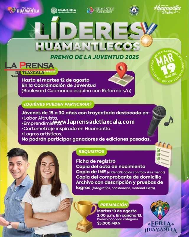 En el marco de las actividades de la Feria Internacional del Arte Efímero y la Dalia 2025, el Gobierno Municipal de Huamantla, a través de la Coordinación de Juventud, convoca a las y los jóvenes del municipio a participar en el Premio de la Juventud Huamantla 2025, que busca reconocer el talento, compromiso y creatividad de las nuevas generaciones.
