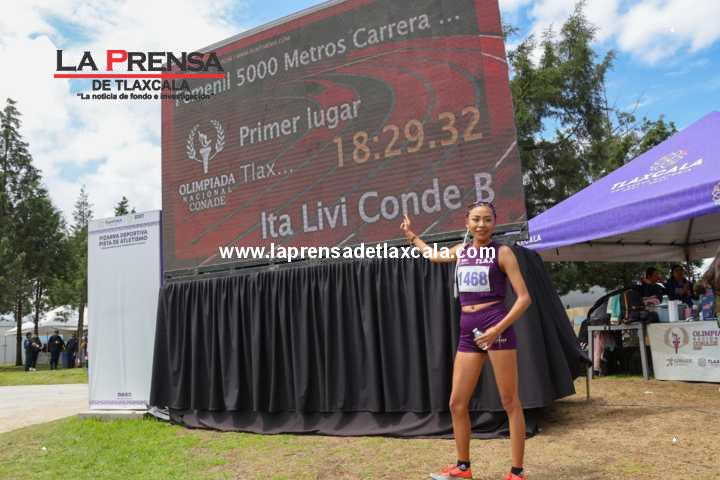 Ita Livi Conde Bado se consagró campeona de la prueba de los 5 mil metros planos Sub-20, al registrar un tiempo de 18:29.32, durante su actuación en la justa deportiva que se celebra en Tlaxcala.