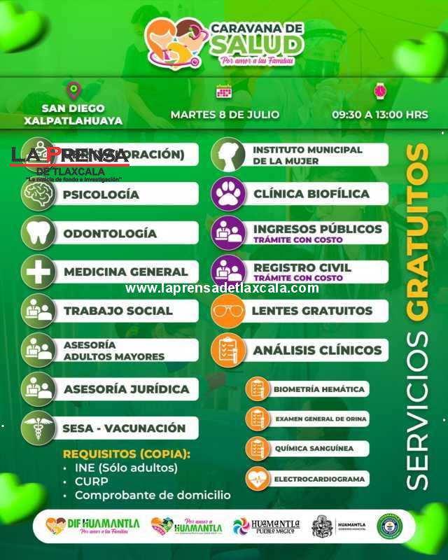 Este martes 8 de julio, el Sistema Municipal para el Desarrollo Integral de la Familia (SMDIF) Huamantla, en coordinación con diversas áreas del Ayuntamiento, llevará a cabo una edición más de la Caravana de Salud y Servicios, en esta ocasión en la comunidad de San Diego Xalpatlahuaya.