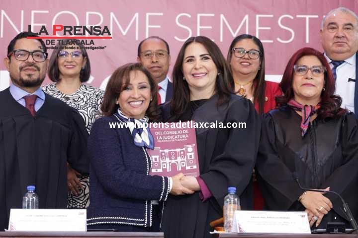 “En este informe hago un reconocimiento público, y además merecido, a nuestra gobernadora por la puesta en marcha de la construcción de 16 nuevas salas de oralidad que marcan un parteaguas en el sistema judicial tlaxcalteca y que nos permitirán contar con una cobertura más amplia, eficiente y digna. No hay precedente de una inversión estatal de esta magnitud para modernizar la justicia en Tlaxcala. Gobernadora, nuevamente, muchas gracias. Es usted la mejor aliada en la impartición de justicia”, comentó.