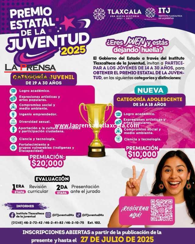 El Instituto Tlaxcalteca de la Juventud (ITJ) dio a conocer que la convocatoria para el Premio Estatal de la Juventud 2025 continúa abierta hasta el próximo 27 de junio, galardón que reconoce el talento, compromiso social, académico, artístico, emprendedor de jóvenes que contribuyen al desarrollo de sus comunidades y del estado.