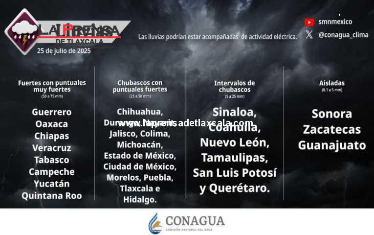 Se pronostican lluvias fuertes (de 25 a 50 mm) para las regiones de Chihuahua, Durango, Nayarit, Jalisco, Colima, Michoacán, Estado de México, Ciudad de México, Morelos, Puebla, Tlaxcala e Hidalgo.