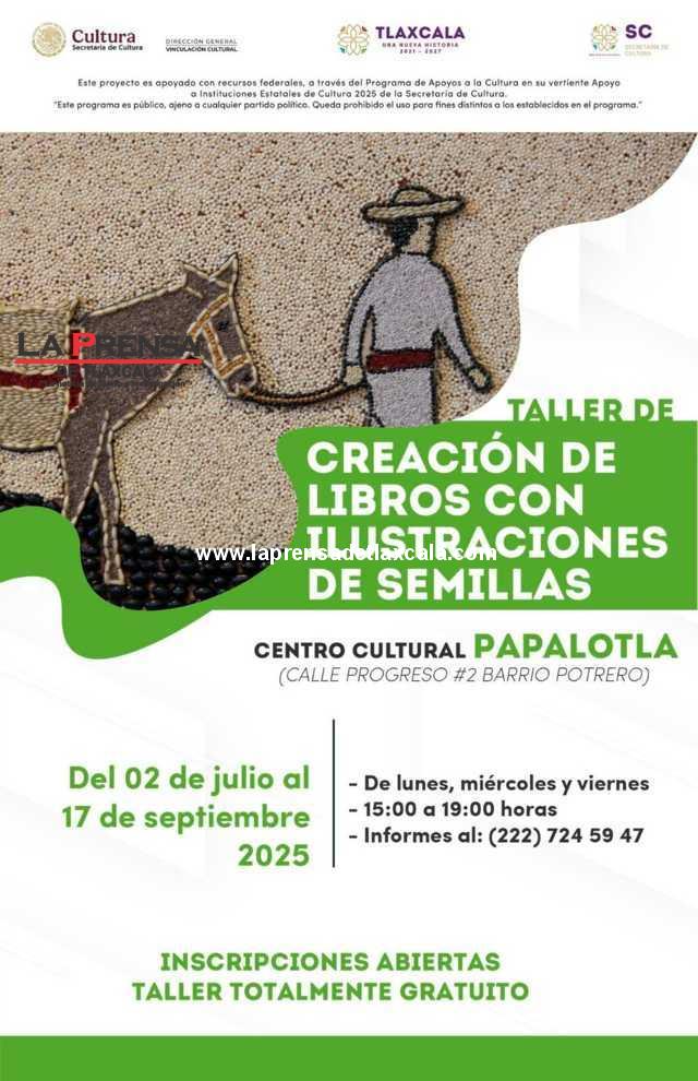 Además, en Contla se realizará el taller Elaboración del Rebozo Tradicional y Cantos en Náhuatl “Zitlaltzitzi”; en Chiautempan Técnicas Artesanales de Estampado Textil en Tela de Algodón; en Huamantla: Vivencias Culturales para Personas de la Tercera Edad y en Papalotla Creación de Libros con Ilustraciones de Semillas