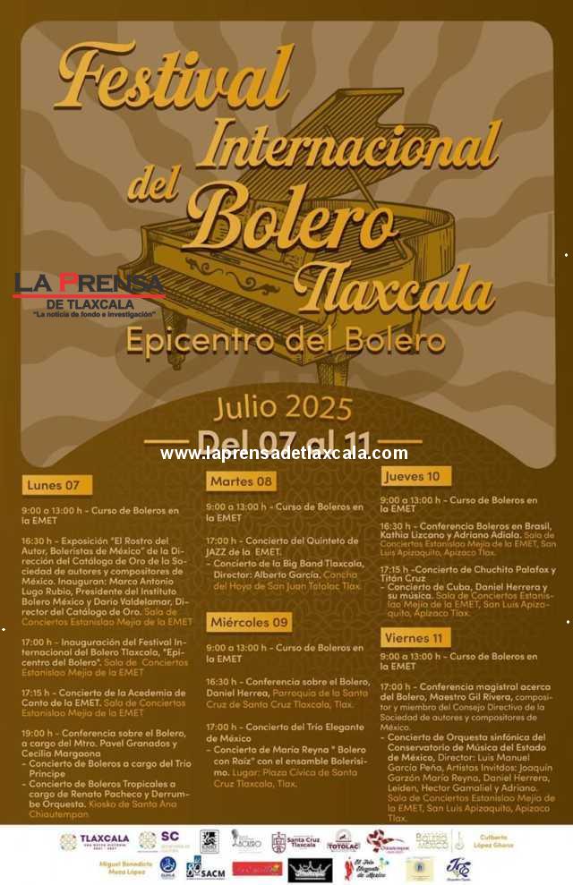 La Secretaría de Cultura (SC) anunció el Primer Festival Internacional del Bolero, que se llevará a cabo, del 7 al 11 de julio, en Tlaxcala bajo el lema “Epicentro del Bolero”, con el objetivo de honrar, preservar y proyectar uno de los géneros musicales más emblemáticos de América Latina.