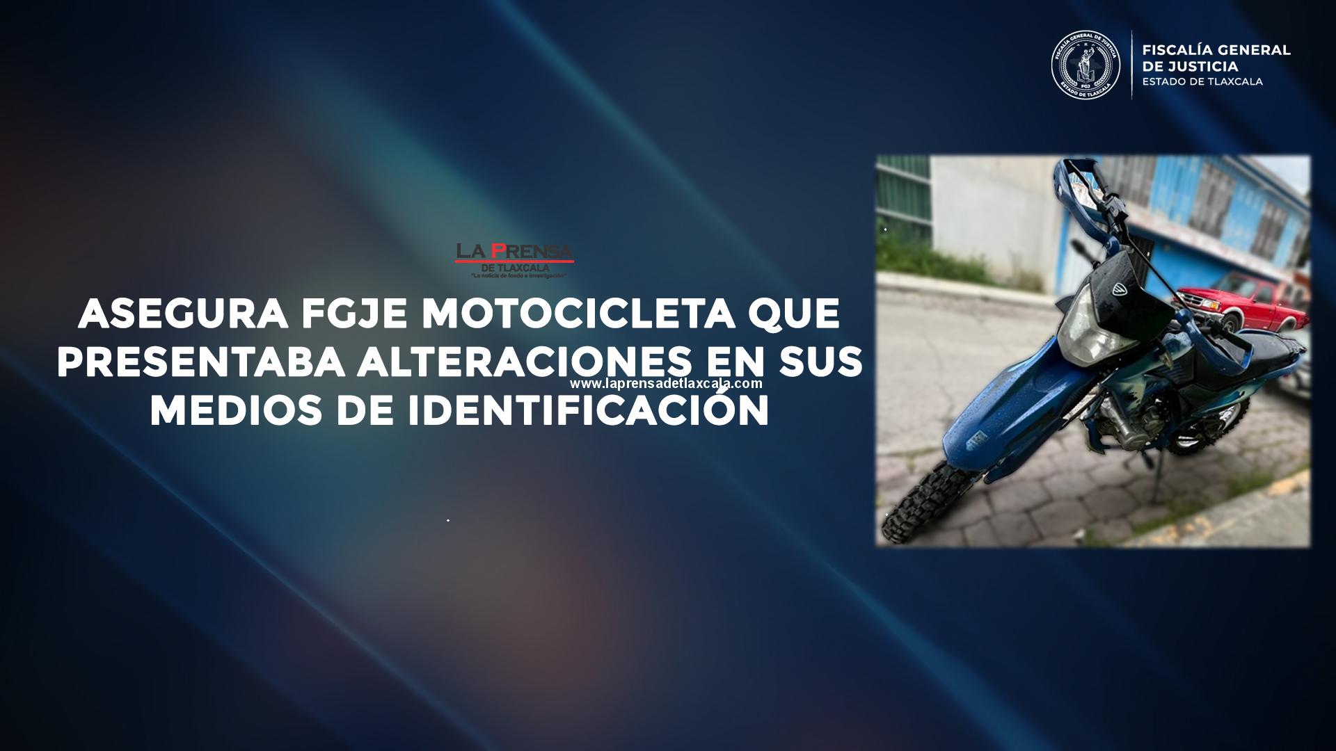 La Policía de Investigación de la Fiscalía General de Justicia del Estado (FGJE) aseguró una motocicleta marca Italika, tipo Cross, modelo 2021, que presentaba alteraciones en sus medios de identificación.