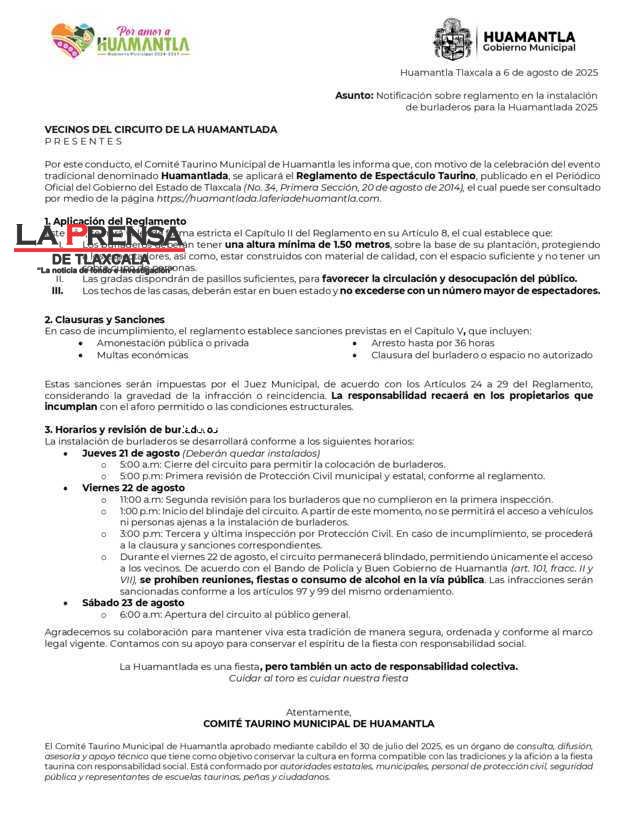 Con la finalidad de cuidar la integridad y seguridad de todos los asistentes al encierro de toros, el Comité Taurino Municipal de Huamantla notifica de manera oficial a todos los vecinos del circuito de la Huamantlada sobre la aplicación estricta del Reglamento de Espectáculo Taurino, publicado en el Periódico Oficial del Gobierno del Estado de Tlaxcala en 2014.