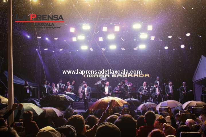 Tlaxco, Tlaxcala, 26 de agosto de 2025. — Ni la fuerte lluvia que cayó la noche del sábado fue impedimento para que cerca de 5 mil personas disfrutaran del gran concierto de la Banda Tierra Sagrada, que llenó de música y alegría la explanada del Parque Municipal en el marco de la Feria del Queso, la Madera y el Pulque 2025.