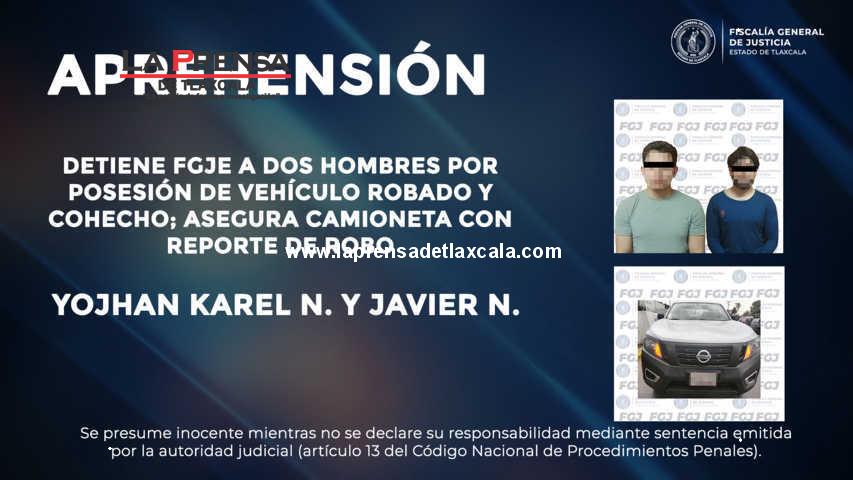 Agentes de la Policía de Investigación de la Fiscalía General de Justicia del Estado (FGJE) detuvieron a Yojhan Karel N. y a Javier N., por los delitos de posesión de vehículo robado y cohecho. Además, aseguraron una camioneta tipo Nissan NP300, color gris, la cual contaba con reporte de robo vigente en el estado de Puebla.