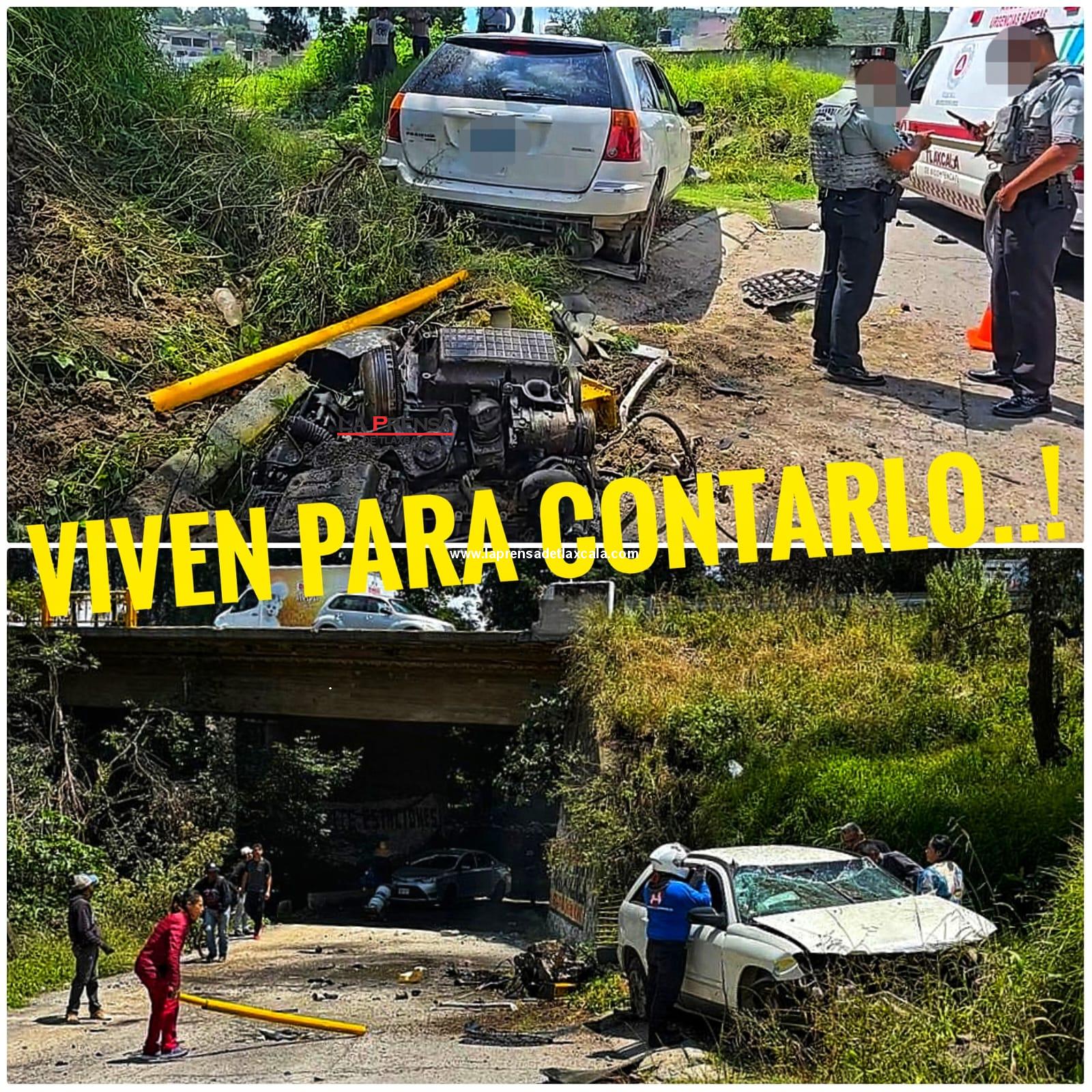 La tarde del sábado, en tránsito sobre la carretera Apizaco-Tlaxcala una pareja de edad madura, “milagrosamente” sobrevivieron a aparatosa caída de un Puente Inferior Vial (PIV), luego de que posiblemente por la mezcla alcohol y volante la camioneta que tripulaban perdiera el control, derribara parte de la estructura de metal y cayera varios metros hasta quedar con visibles huellas de accidente a un costado de una vialidad secundaria; donde fueron asistidos por paramédicos y Guardia Nacional (GN).