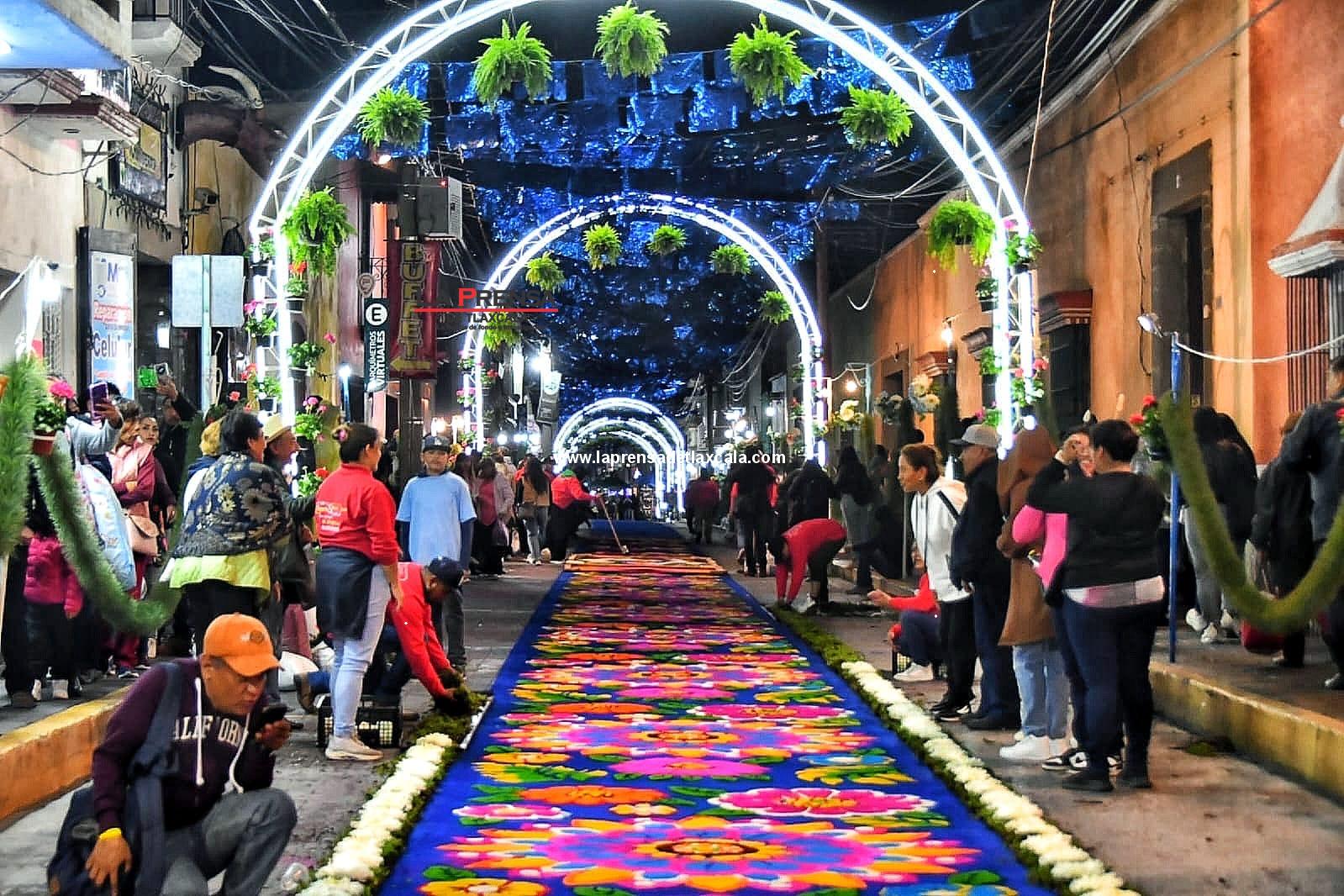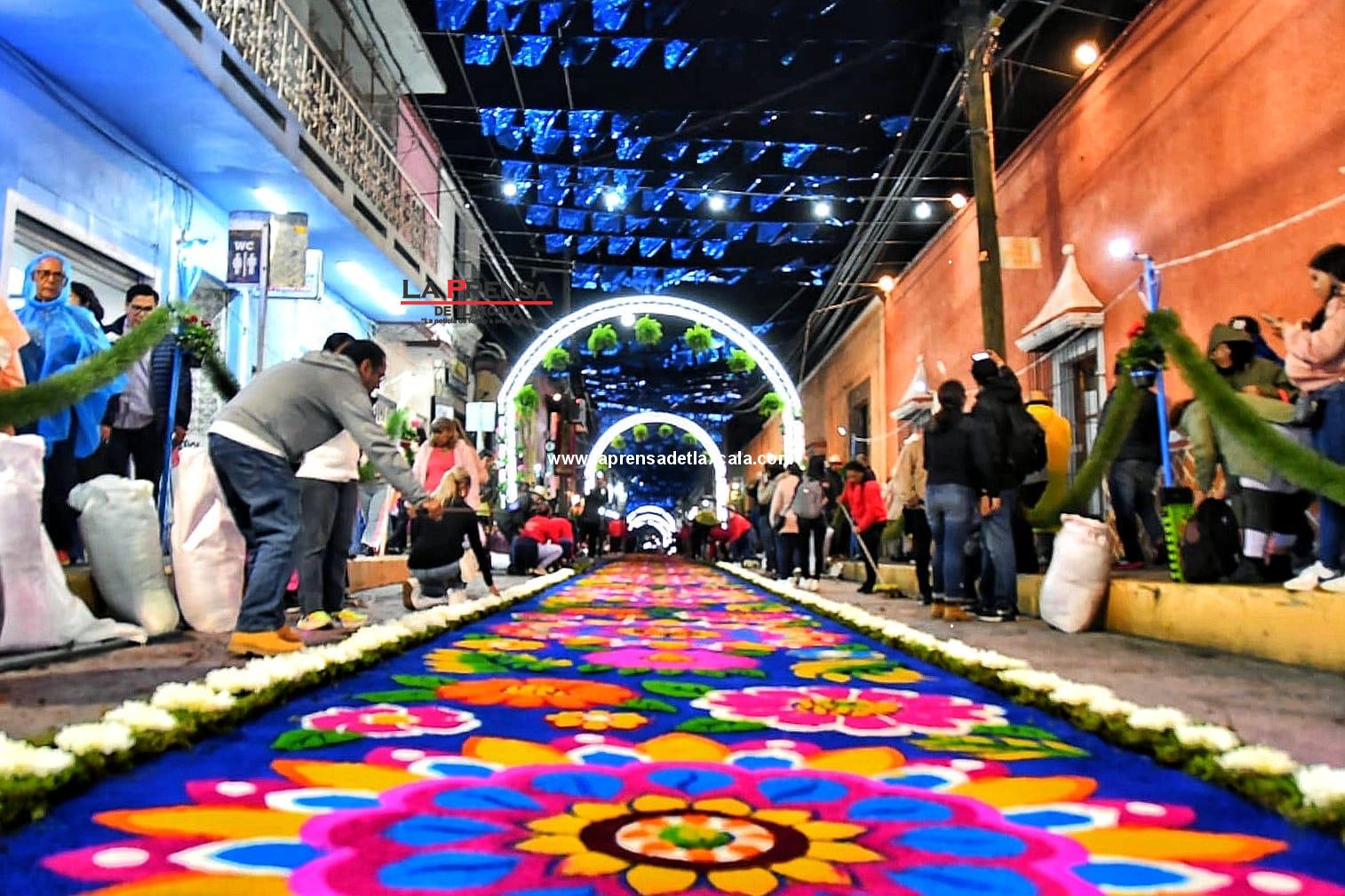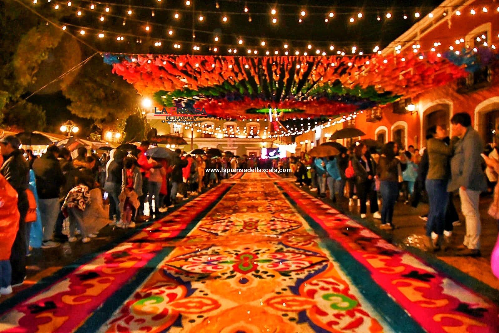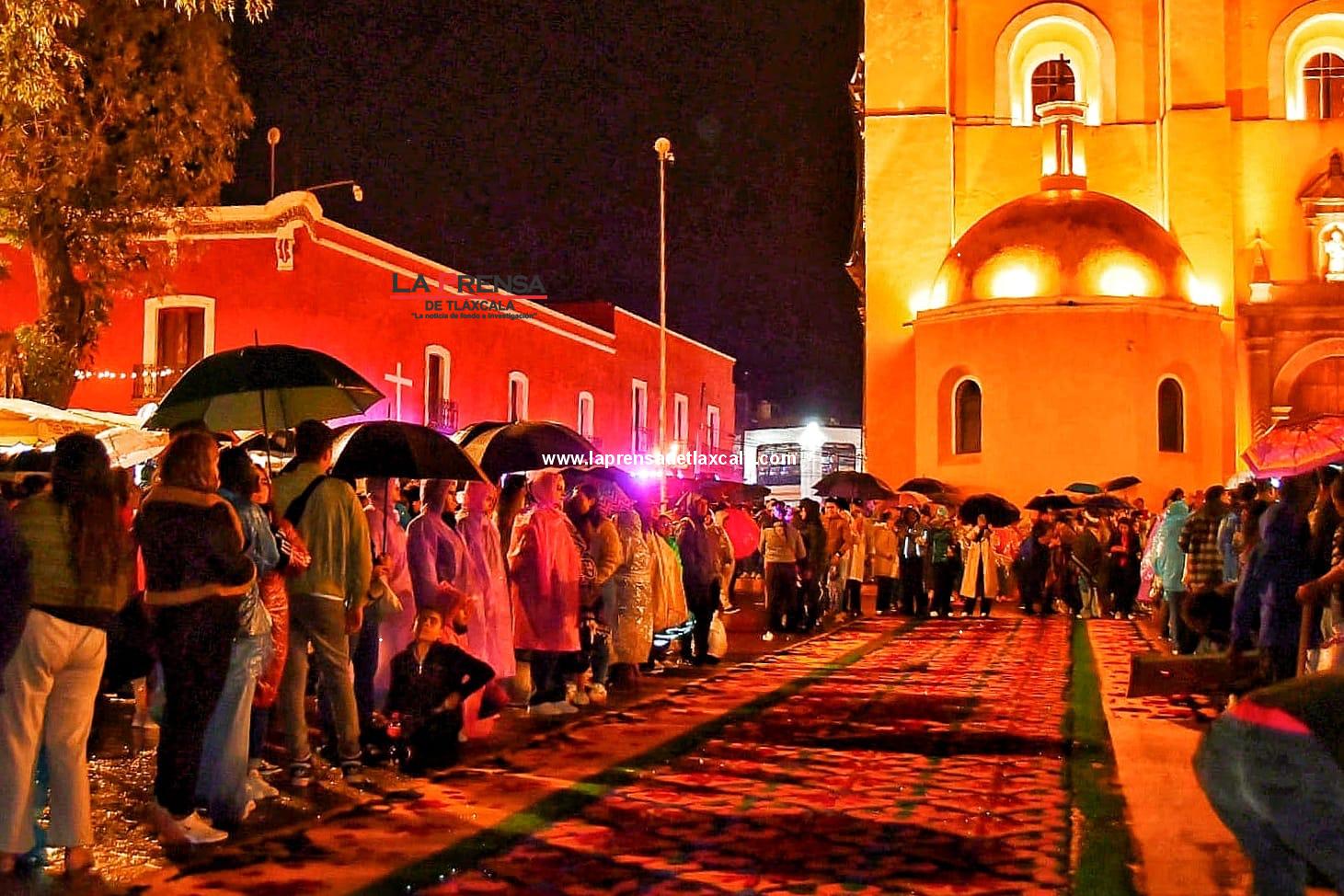 A pesar de la ligera lluvia que se presentó durante la noche, los artesanos y alfonbristas se apresuraron a rehacer sus obras, manteniendo viva la tradición y mostrando la devoción que distingue a esta celebración.
