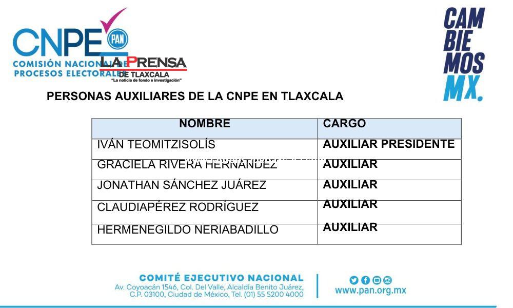 La Comisión Nacional de Procesos Electorales (CNPE) del Partido Acción Nacional (PAN) designó a cinco auxiliares que serán responsables de organizar y supervisar las asambleas municipales en Tlaxcala, en las que se definirán propuestas para el Consejo Nacional, Consejo Estatal y las dirigencias de los Comités Directivos Municipales.