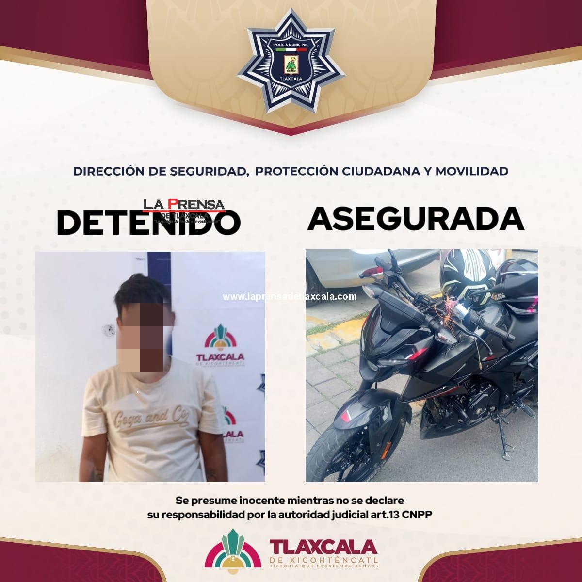 Gracias a la labor de patrullaje preventivo, elementos de la Dirección de Seguridad, Protección Ciudadana y Movilidad del Municipio de Tlaxcala lograron la recuperación de una motocicleta con reporte de robo y la detención de un hombre de 19 años de edad.