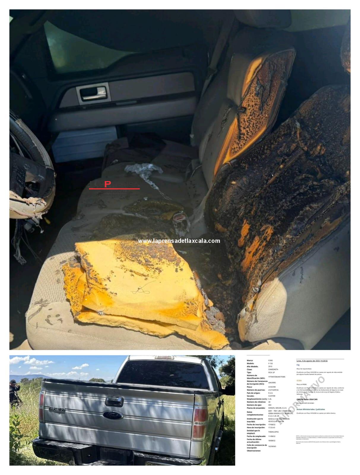 La mañana de este 4 de agosto, autoridades de Cuapiaxtla, Tlaxcala, aseguraron una camioneta Ford F-150, color gris, abandonada en terrenos de labor, entre San Francisco Cuexcontzi y la meseta del barrio de Guadalupe, colindante con El Carmen Tequexquitla. La unidad, con placas de circulación VU9220B de Tamaulipas, presentaba huellas de incendio, lo que sugiere un intento de destruir evidencia. Este hallazgo podría estar relacionado con el homicidio de Roberto V., ocurrido el 31 de julio en el centro de El Carmen Tequexquitla.