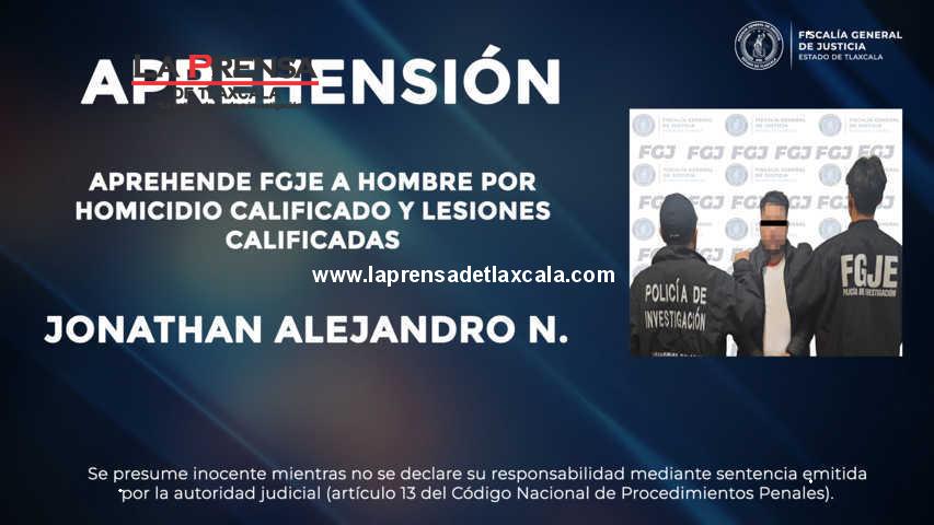 La Policía de Investigación de la Fiscalía General de Justicia del Estado (FGJE) aprehendió a Jonathan Alejandro N. por los delitos de homicidio calificado y lesiones calificadas, por los hechos ocurridos el 21 de julio de 2024 en el municipio de Huamantla.