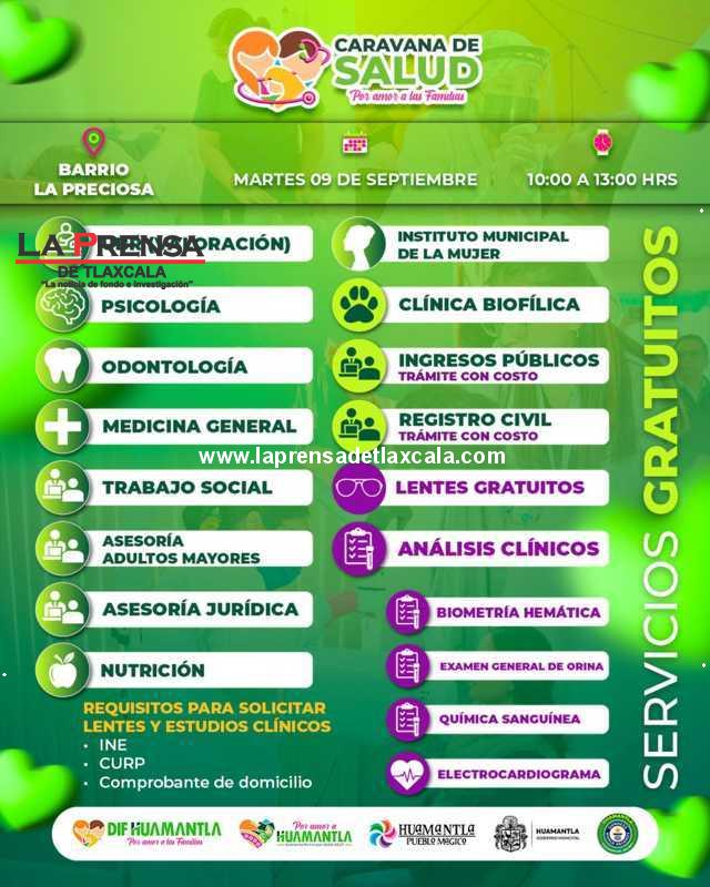 El Ayuntamiento de Huamantla, que encabeza Salvador Santos Cedillo, informa que este martes 9 de septiembre de 10:00 a 13:00 horas la Caravana de Salud y Servicios estará presente en el Barrio de La Preciosa, con el objetivo de acercar servicios médicos gratuitos y orientación ciudadana a las familias de esta zona.