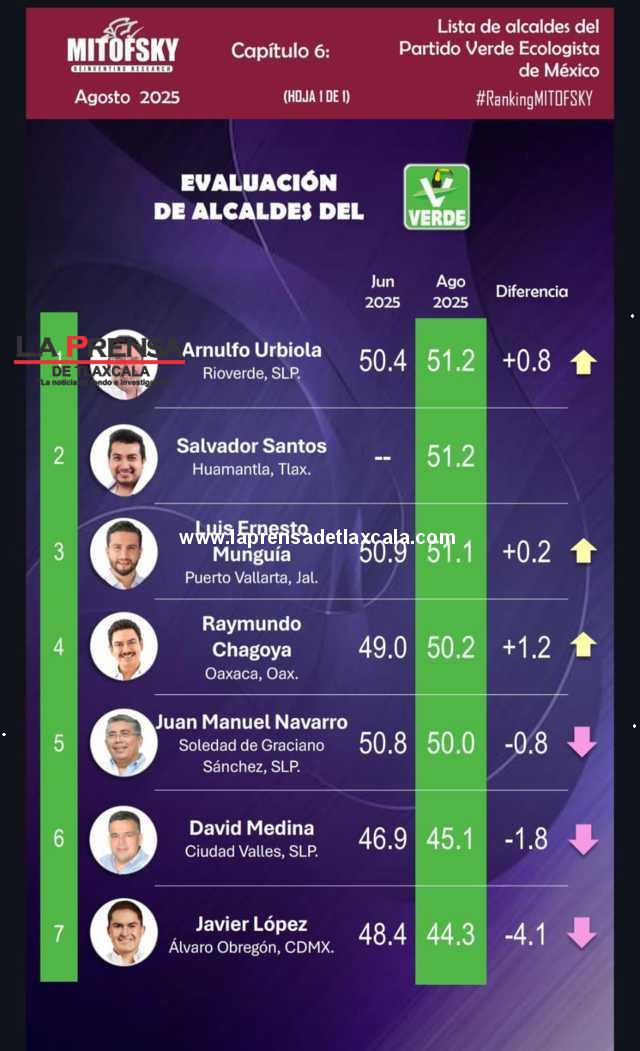 De acuerdo con el estudio más reciente, Santos Cedillo se mantiene en el segundo lugar dentro del ranking de presidentes municipales pertenecientes al Partido Verde Ecologista de México, con un 51.2% de nivel de aprobación, porcentaje que refleja estabilidad en comparación con los resultados obtenidos en junio pasado.