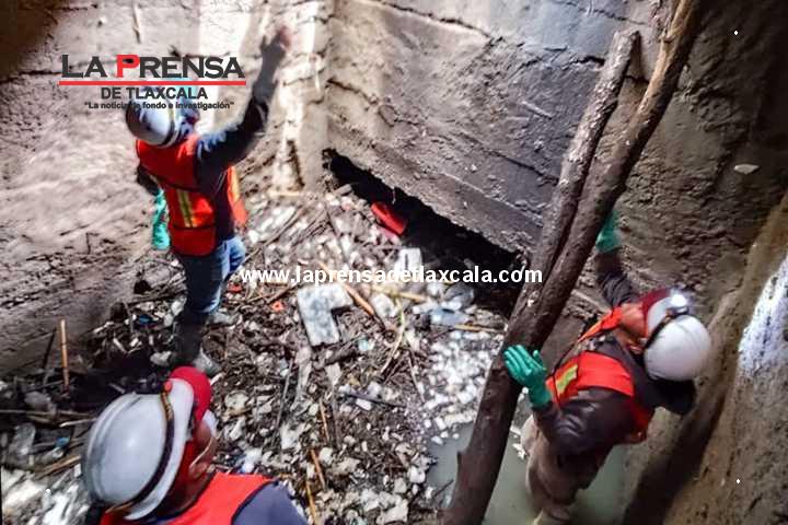 Con maquinaria pesada y brigada especializada, el Ayuntamiento de Tlaxcala, a través de la Comisión de Agua Potable y Alcantarillado del Municipio (CAPAM), puso en marcha acciones de mantenimiento de la red de drenaje de la capital con trabajos en la calle Del Vecino, donde se realizó el desazolve del canal subterráneo