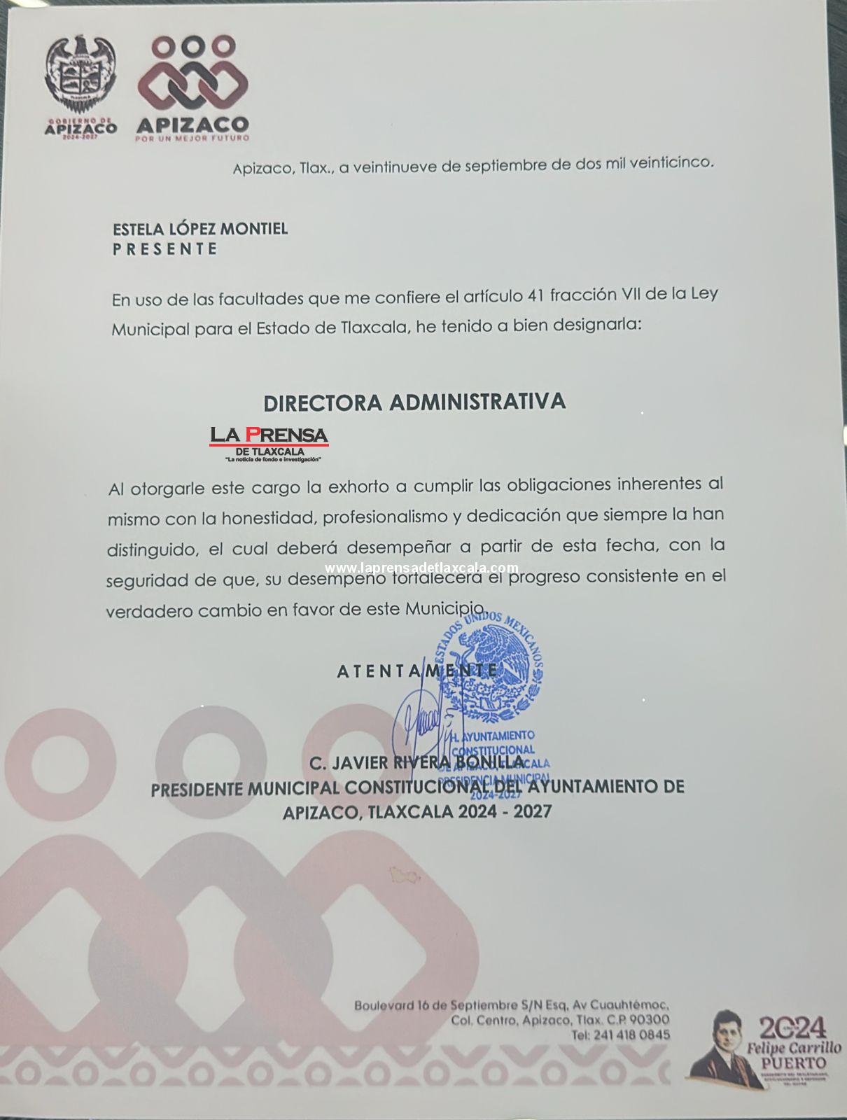 El presidente municipal de Apizaco, Javier Rivera Bonilla, designó a Estela López Montiel como Directora Administrativa del Ayuntamiento de Apizaco, quien cuenta con la capacidad y el compromiso para contribuir al buen funcionamiento de la administración pública.