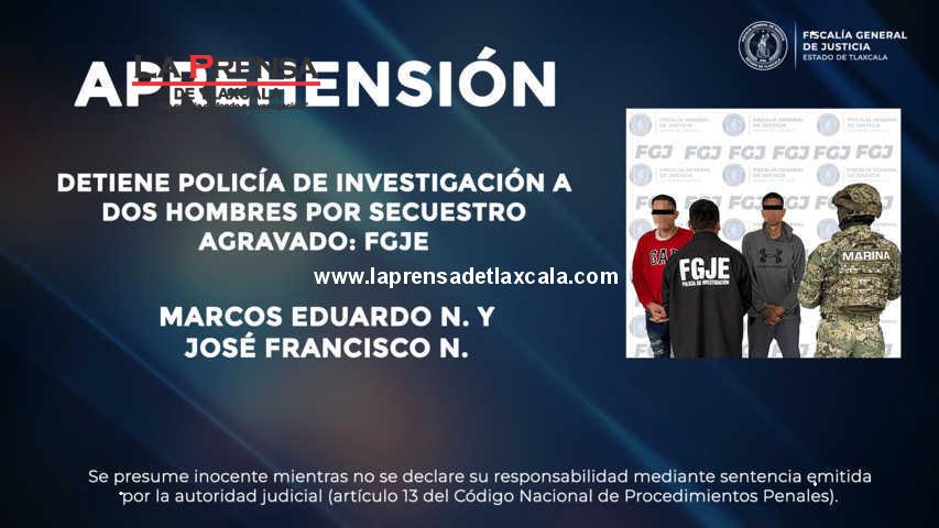 Como resultado de una acción operativa basada en trabajos de inteligencia, la Policía de Investigación de la Fiscalía General de Justicia del Estado (FGJE) logró la detención de Marcos Eduardo N. y José Francisco N., por el delito de secuestro agravado, ocurrido el 18 de mayo de 2025 en el municipio de Tetla de la Solidaridad.