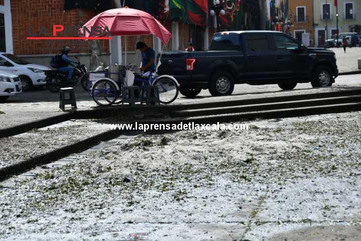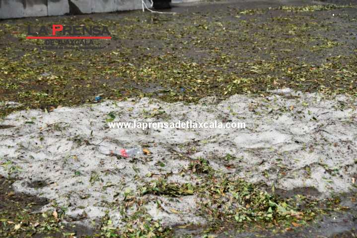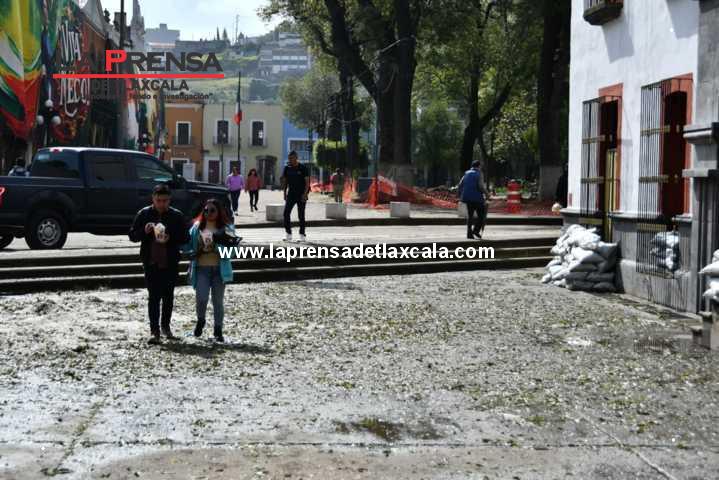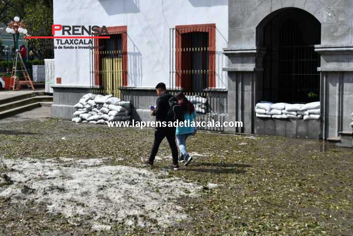 Tras la fuerte granizada registrada la tarde de ayer, la capital tlaxcalteca presentó diversas afectaciones en sus principales calles. El hielo acumulado provocó la caída de ramas y hojas que obstruyeron el paso de transeúntes en banquetas, principalmente en la zona frente a la Secretaría de Gobernación.