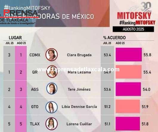 De acuerdo a la medición, la gobernadora de Tlaxcala alcanzó un nivel de aprobación del 51.8%, con lo cual se situó en el Top 10, donde también figuran Clara Brugada, de la Ciudad de México (55.8%); Mara Lezama, de Quintana Roo (55.4%); Ricardo Gallardo, de San Luis Potosí (54.4%), Tere Jiménez, de Aguascalientes (54.0%); Julio Menchaca, de Hidalgo (53.3%), Pablo Lemus, de Jalisco (52.9%); Manolo Jiménez, de Coahuila (51.9%); Libia Dennise García, de Guanajuato (51.9%); y Mauricio Kuri, de Querétaro (51.8%).