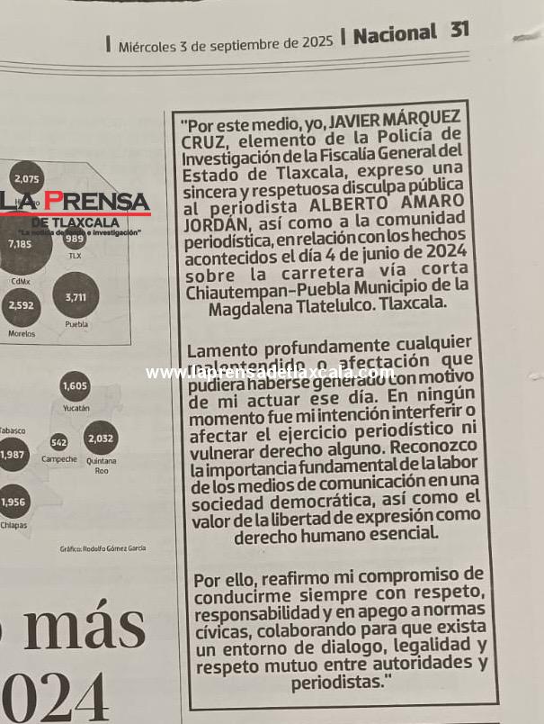 “Por este medio, yo, JAVIER MÁRQUEZ CRUZ, elemento de la Policia de Investigación de la Fiscalía General del Estado de Tlaxcala, expreso una Sincera y respetuosa disculpa pública al periodista ALBERTO AMARO JORDÁN, así como a la comunidad periodística, en relación con los hechos acontecidos el día 4 de junio de 2024 sobre la carretera vía corta Chiautempan-Puebla Municipio de la Magdalena Tlatelulco. Tlaxcala.