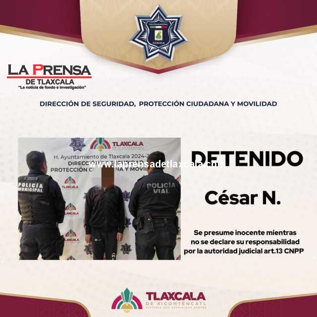 El detenido, identificado como César “N”, de 40 años de edad y originario del Estado de México, fue trasladado a la Dirección de Seguridad, Protección Ciudadana y Movilidad de la capital tlaxcalteca para iniciar con el protocolo y ponerlo a disposición de la autoridad correspondiente.