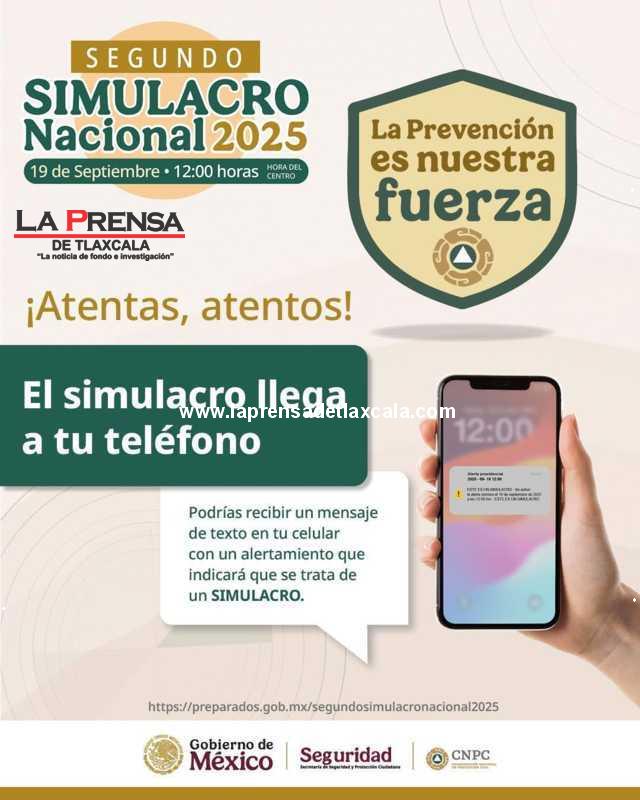 El próximo viernes 19 de septiembre, a las 12:00 horas, Tlaxcala participará en el Segundo Simulacro Nacional 2025, con la hipótesis de un sismo de magnitud 8.1. La Coordinación Estatal de Protección Civil (CEPC) subrayó que la participación ciudadana será clave para fortalecer la cultura de la prevención y mejorar la capacidad de respuesta, a fin de salvar vidas en caso de una emergencia real.