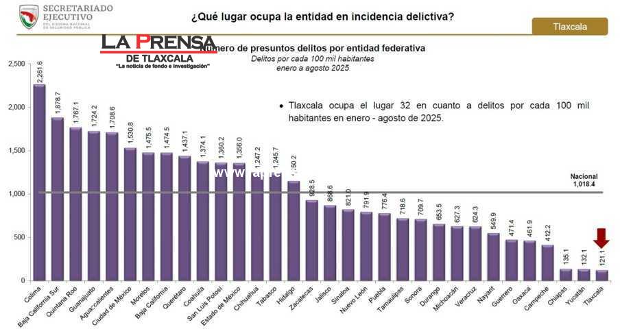 De enero a agosto de este año, Tlaxcala fue el estado con menor incidencia delictiva en México, con una tasa de 121.1 delitos por cada 100 mil habitantes, de acuerdo con el más reciente informe del Secretariado Ejecutivo del Sistema Nacional de Seguridad Pública (SESNSP).