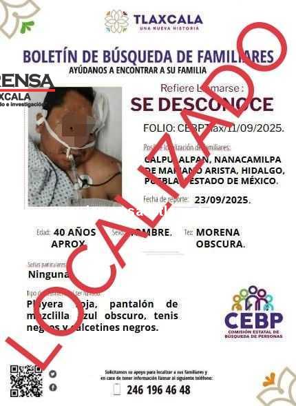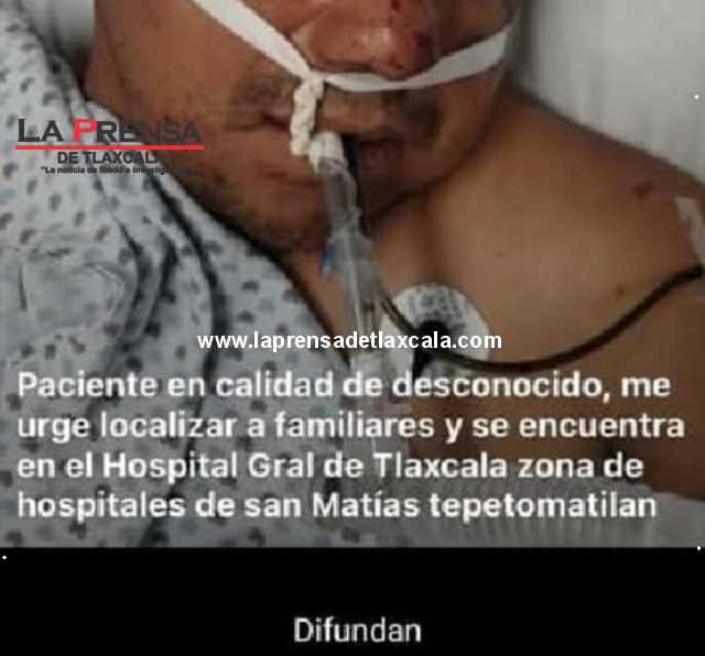 Se sabe, que quien permanece como “DESCONOCIDO” en el perfil oficial en la red social Facebook de la Comisión de Búsqueda de Personas (CEBP), hace horas en correspondencia al municipio de Calpulalpan -en límites con el Estado de México- fue hallado por las autoridades que atendieron reporte de hombre con trauma severo de cráneo abandonado en vía pública; cuyas características coincidían con el “buscado”, que según trascendido había sido supuestamente “atropellado” por su propia camioneta marca Renault Duster café, modelo 2016, placas XUA-013-D particulares de Tlaxcala de la cuál se desconoce su paradero.