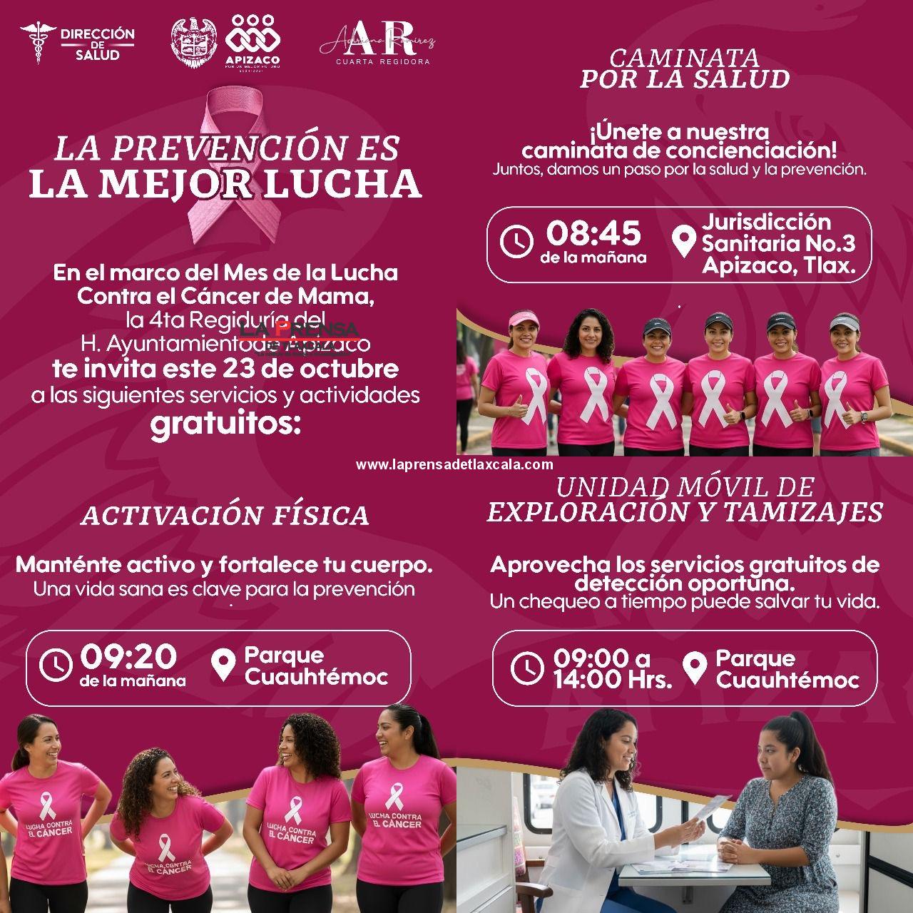 El Ayuntamiento de Apizaco y la Cuarta Regiduría organizan actividades gratuitas este 23 de octubre para fomentar la detección oportuna y el autocuidado.