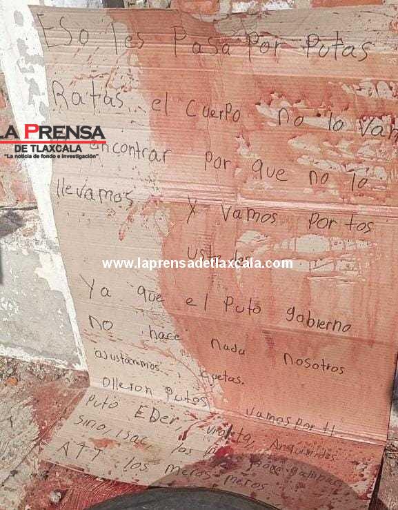 Elementos de la Policía Municipal de San Damián Texoloc acudieron como primeros respondientes. Al sitio se localizaron dos cartuchos percutidos calibre 16 mm color rojo, aparentemente de escopeta, líquido con características hemáticas y un cartón con el siguiente mensaje: “Eso les pasa por putas ratas, el cuerpo no lo van a encontrar porque nos lo llevamos y vamos por todos ustedes (…) Vamos por ti puto Eder, Violeta, Arquímides, Siria, Isac, los niños roba gallinas. Att. Los meros meros”. Se realizó inspección perimetral sin localizar más indicios.